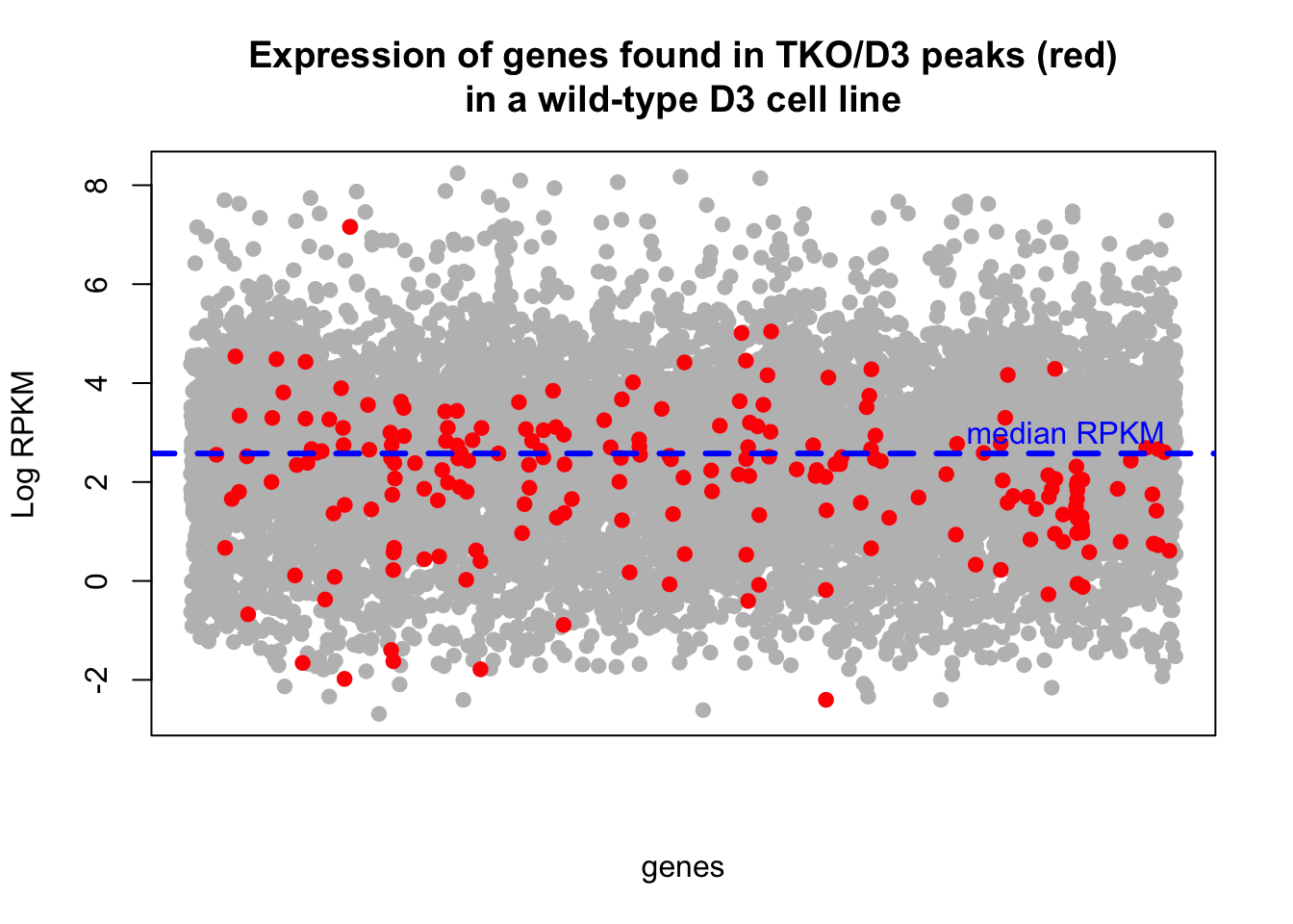 In this section we look at the expression of genes regulated by TKO/TASOR. We found these genes in previous steps by looking at the overlap between peaks that dissapear in TKO samples with respect to D3 and the gene annotation.